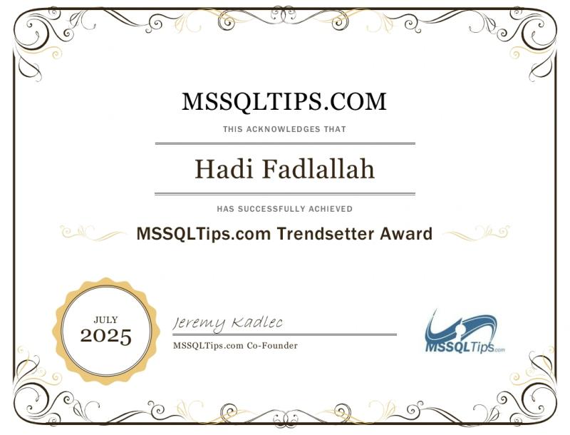 I am honored to receive the Trendsetter award from MSSQLTips.com after publishing 25 articles. Special thanks goes to Jeremy Kadlec for his unwavering support and guidance 🙏
